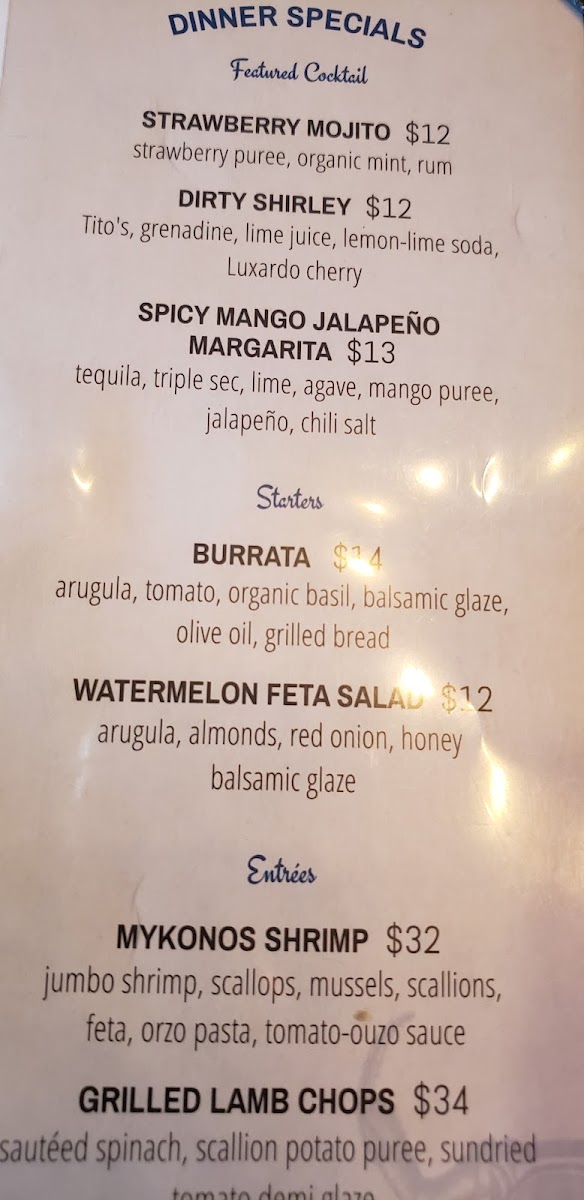 Start your day with bright, flavorful options like the Spring House Salad or the Burrata Caprese, perfect for a calm morning or weekend brunch. Midday meals include approachable handhelds, such as the Chicken Gyro or Crab Cake Sandwich, alongside warming soups and crisp, satisfying flatbreads. Dinner invites you to enjoy elevated seafood and Mediterranean specialties like Grilled Bronzini, Horseradish Crusted Salmon, or the richly seasoned Chicken Souvlaki Platter.